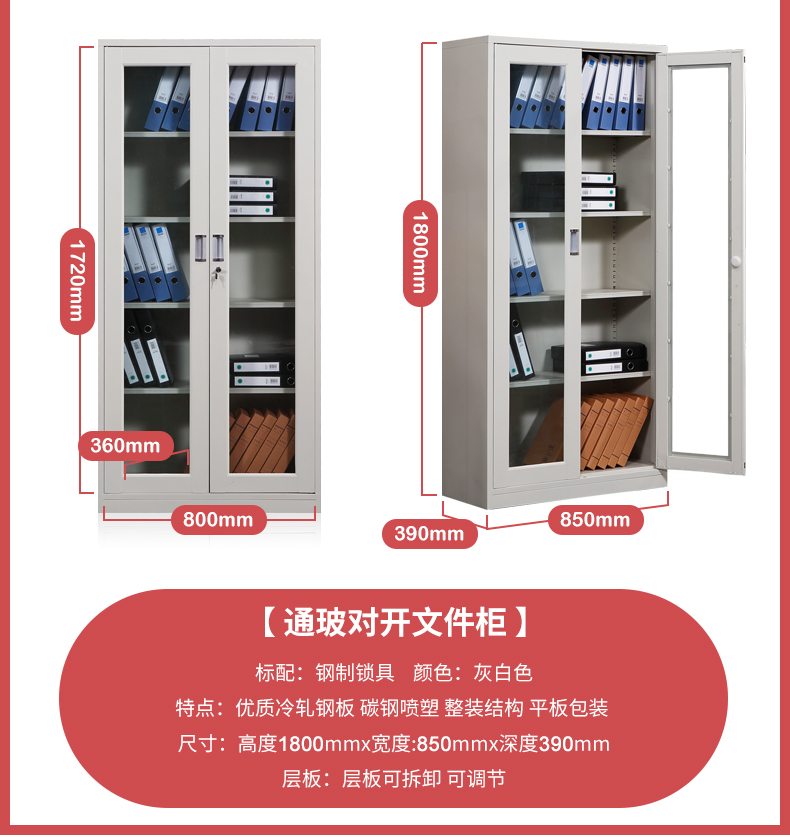 五层文件柜 普希顿 灰色 高185cmX宽85cmX厚40cm 两开门 中间上下透明玻璃 1个/箱