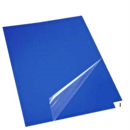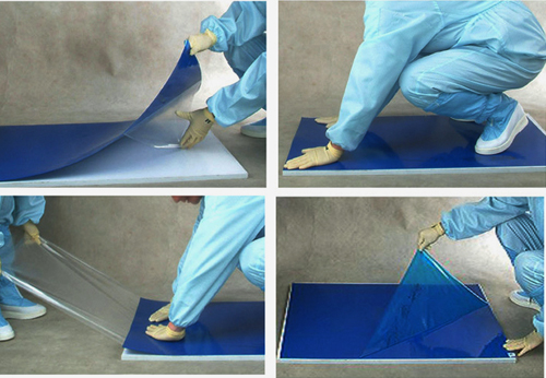 第二步:从粘尘垫一角标签处撕开表面层无粘性保护薄膜 使得有粘性薄膜暴露于空气中