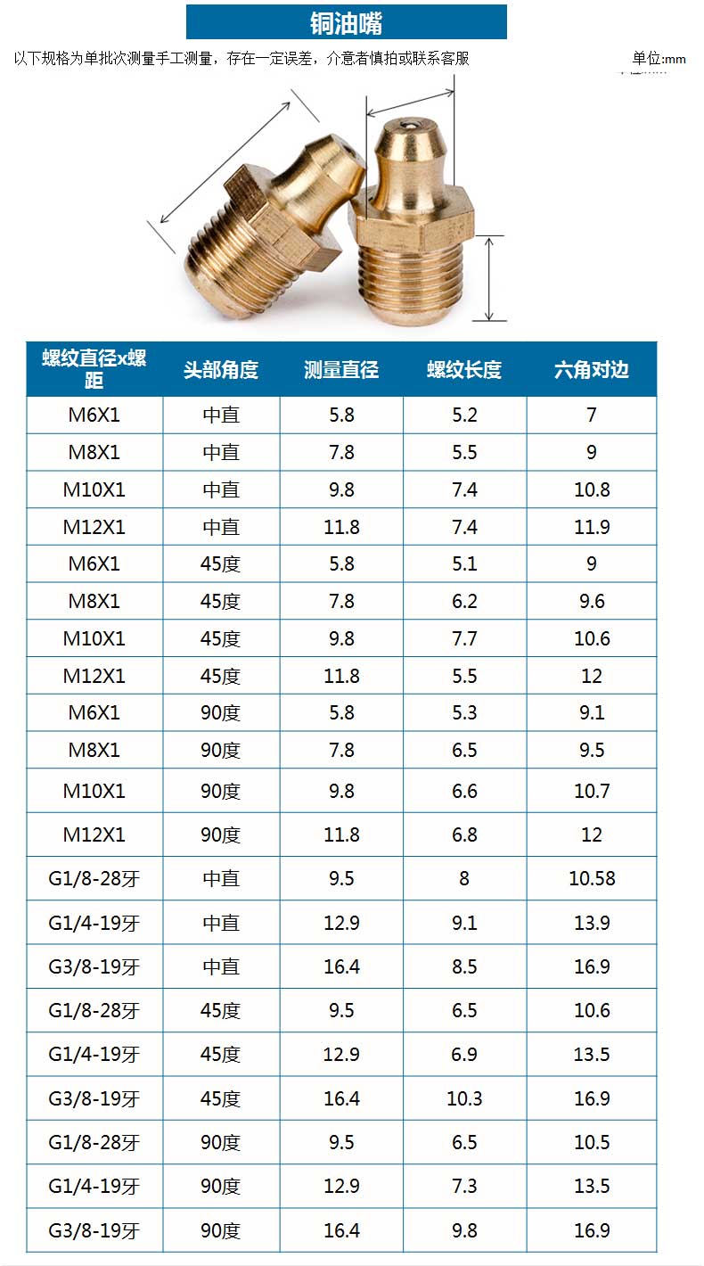 商品名称:黄油嘴铜油嘴油嘴头铜油杯油咀油枪注油嘴黄油枪头弯油嘴M6M8M10 M6*1 (中直) 优质