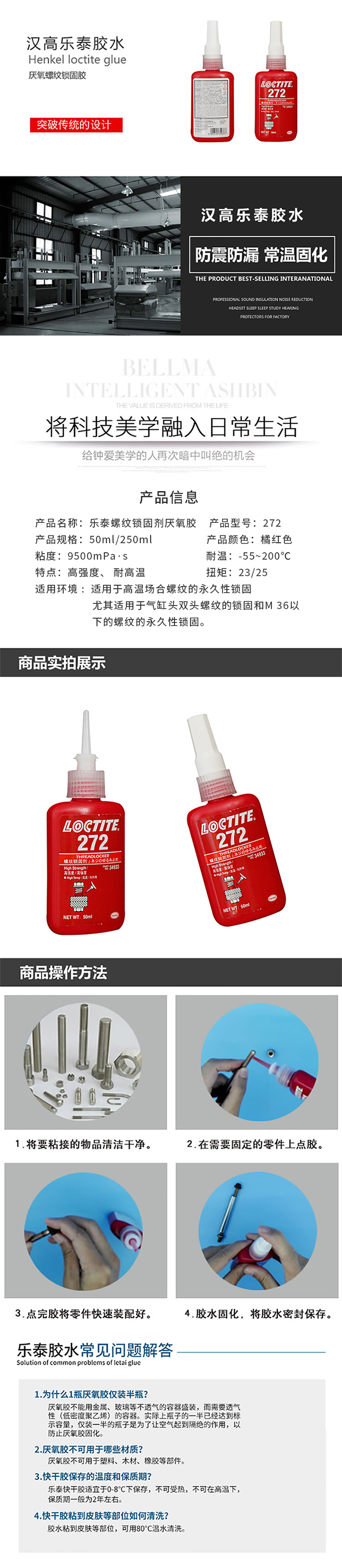 规格型号:乐泰272密封胶 螺纹锁固胶-中粘度耐高温型 272 桔红色 50ml/支