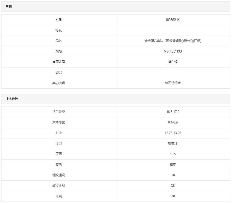 规格型号:全金属六角法兰面锁紧螺母(镶片式)(厂标) M8-1.25*13S