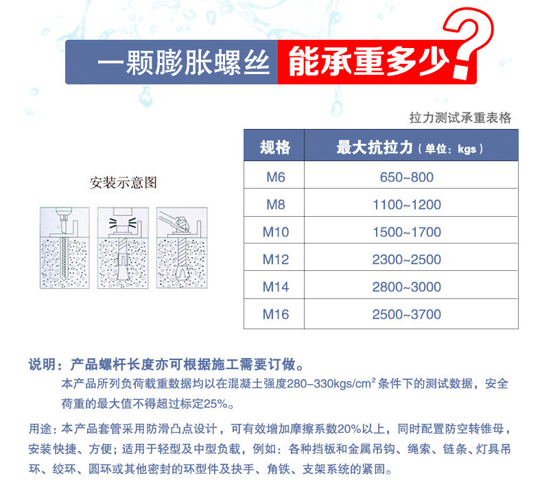 | 尺寸 | 规格如Ф10*M8*60表示套管外径10mm,螺丝的螺纹直径8mm,膨胀螺丝长60mm(不含头部厚度) | ||